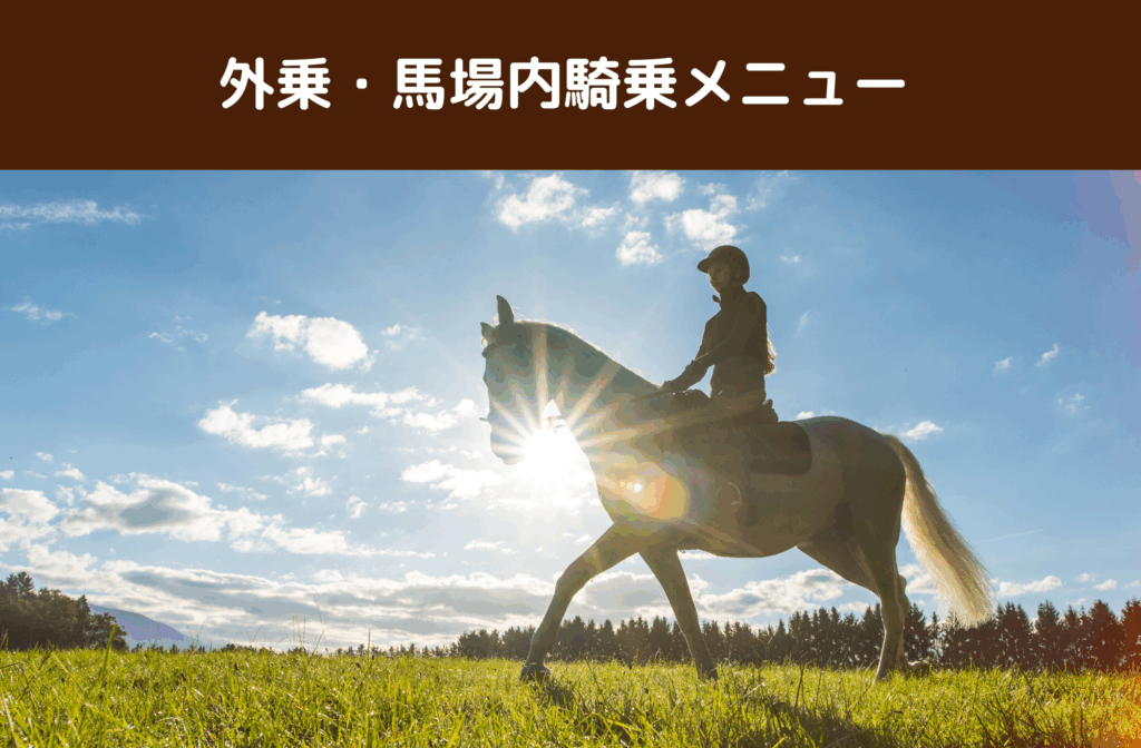 各メニューの内容や実施日などは、こちらのページ→「外乗・馬場内騎乗メニュー」をご覧ください。