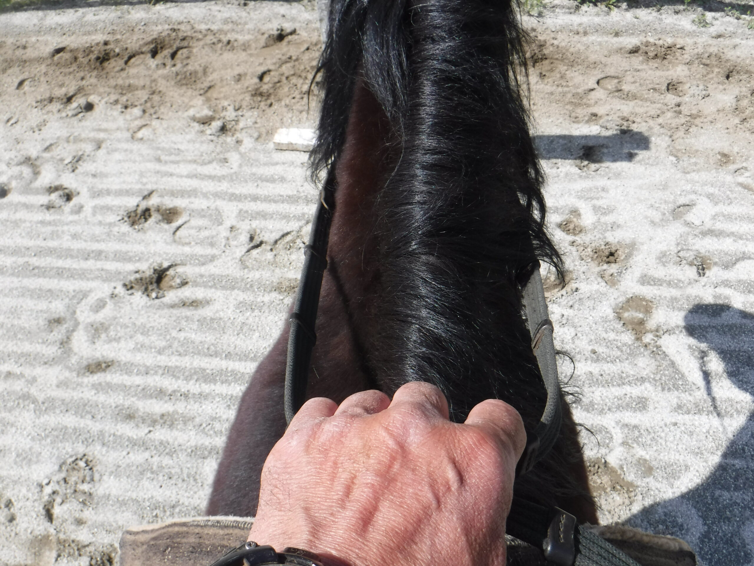 左手の小指で馬の左の口角に、人差し指で右の口に、コンタクトを取ります。