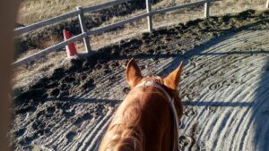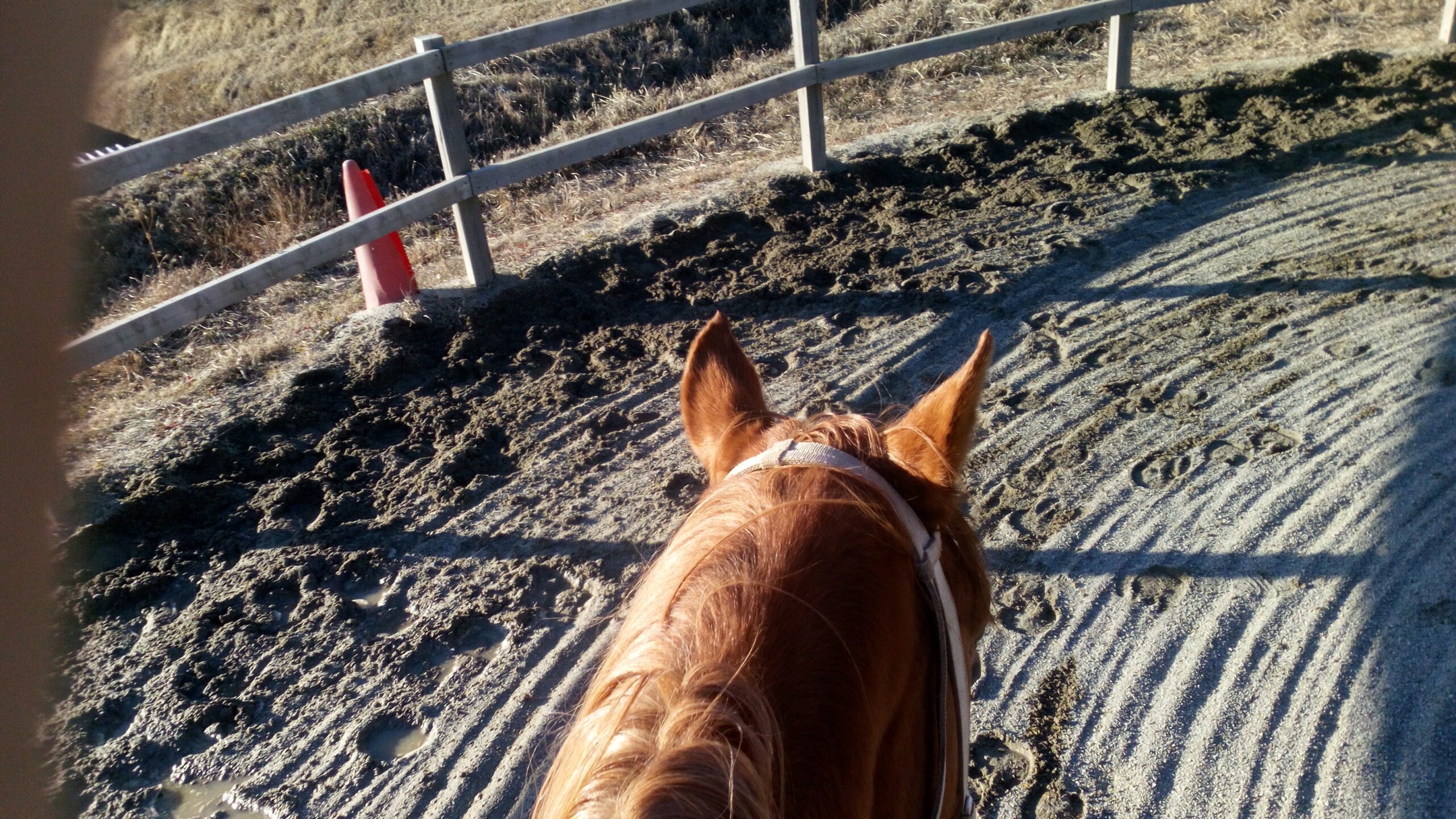 丸々3日間、馬房に詰め込まれた状態のある午後、馬房から出して馬装しグジャグジャな馬場で乗りました。